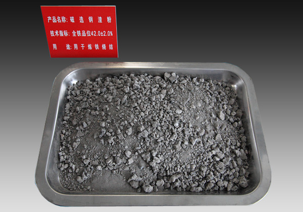 磁選鋼渣粉:熱悶后的鋼渣經(jīng)過(guò)破碎、篩分、磁選得到的10mm以下,含鐵品位較高的含鐵物料,用于煉鐵燒結(jié)。