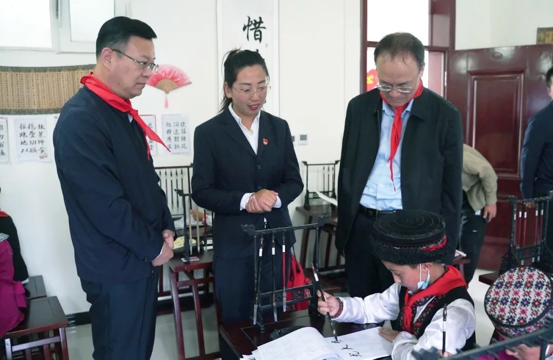 (鞍鋼集團援建的國學課堂內(nèi),塔吉克族學生正在練習書法,譚成旭等駐足細細觀看) 當日下午,譚成旭一行來到塔縣拉齊尼小學,參觀鞍鋼集團援建的愛國主義教育基地,考察書法課堂等項目。在愛國主義教育館,塔吉克族少先隊員為遠道而來的鞍鋼集團客人系上鮮艷的紅領(lǐng)巾。在書法課堂,譚成旭一行觀看了塔吉克族學生練習書法的情況。