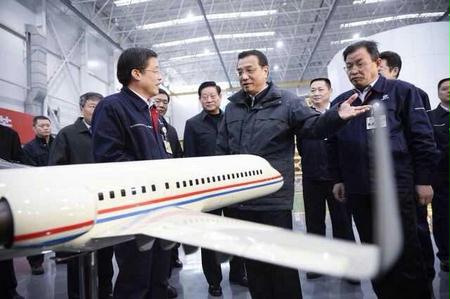 1月28日,李克強總理到中航工業(yè)第一飛機設計研究院考察。他說,這里集成了中國航空工業(yè)的重大技術(shù)研發(fā),中國航空工業(yè)必須要走自己的路。臨行前,研發(fā)人員送給總理一款先進飛機的模型,李克強愉快接過,勉勵大家早日造出真機,不僅要在中國藍天翱翔,也要飛向世界。