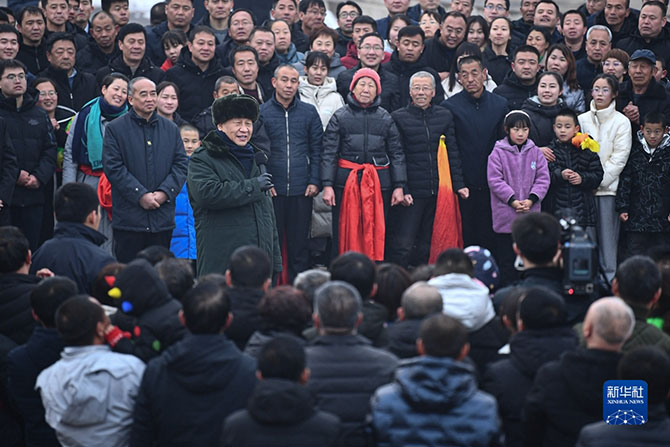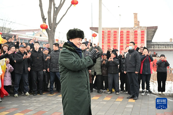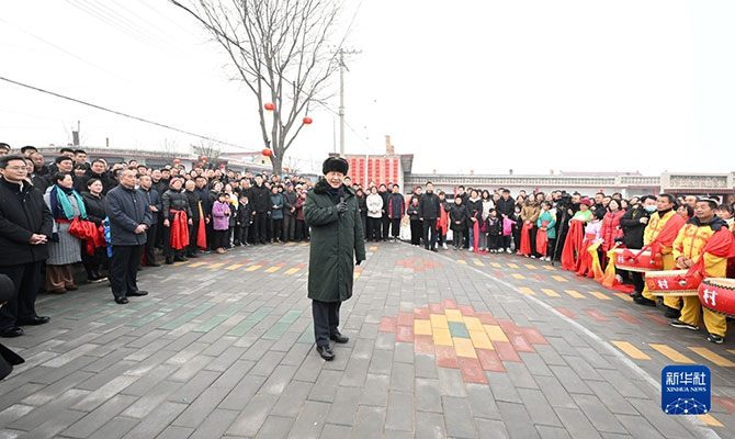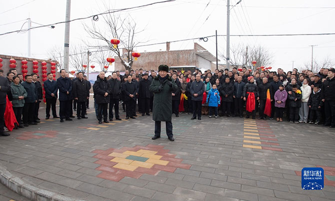 村文化廣場(chǎng)上十分熱鬧,村民們打起威風(fēng)鑼鼓、扭起秧歌歡慶佳節(jié)??吹娇倳泚?lái)了,人們高興地歡呼起來(lái)。習(xí)近平對(duì)鄉(xiāng)親們說(shuō),我們黨的根本宗旨就是為人民群眾辦好事,為人民群眾幸福生活拼搏、奉獻(xiàn)、服務(wù)。我們?nèi)缙诖蜈A了脫貧攻堅(jiān)戰(zhàn),如期實(shí)現(xiàn)了全面建成小康社會(huì)目標(biāo),現(xiàn)在踏上了全面建設(shè)社會(huì)主義現(xiàn)代化國(guó)家新征程。建設(shè)現(xiàn)代化國(guó)家離不開農(nóng)業(yè)農(nóng)村現(xiàn)代化,要繼續(xù)鞏固脫貧攻堅(jiān)成果,扎實(shí)推進(jìn)鄉(xiāng)村振興,讓群眾生活更上一層樓,在推進(jìn)農(nóng)業(yè)農(nóng)村現(xiàn)代化中越走越有奔頭。