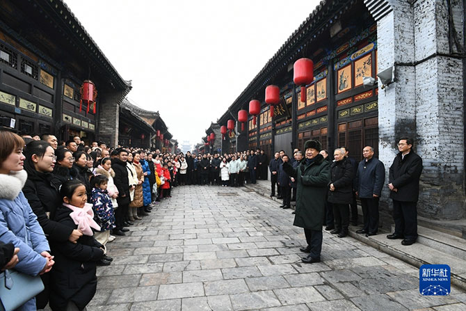 古城南大街年味濃郁。習(xí)近平沿街巷察看古城風(fēng)貌,走進(jìn)平遙牛肉店、推光漆器店、東湖老醋坊,了解當(dāng)?shù)匚幕z產(chǎn)保護(hù)利用和開展特色經(jīng)營(yíng)情況,并購(gòu)買了平遙牛肉、餃子醋等年貨,還參與了陳醋發(fā)酵打耙。他指出,要做優(yōu)秀傳統(tǒng)文化傳承者,保護(hù)好推光漆器等文化瑰寶,把富有民族特色的傳統(tǒng)文化產(chǎn)業(yè)發(fā)揚(yáng)光大、推向世界?,F(xiàn)場(chǎng)群眾紛紛向總書記問(wèn)好,習(xí)近平向大家揮手致意,給大家拜年。