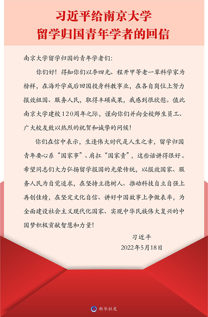 新華社北京5月19日電 中共中央總書記、國家主席、中央軍委主席習近平5月18日給南京大學的留學歸國青年學者回信,對他們寄予殷切期望。