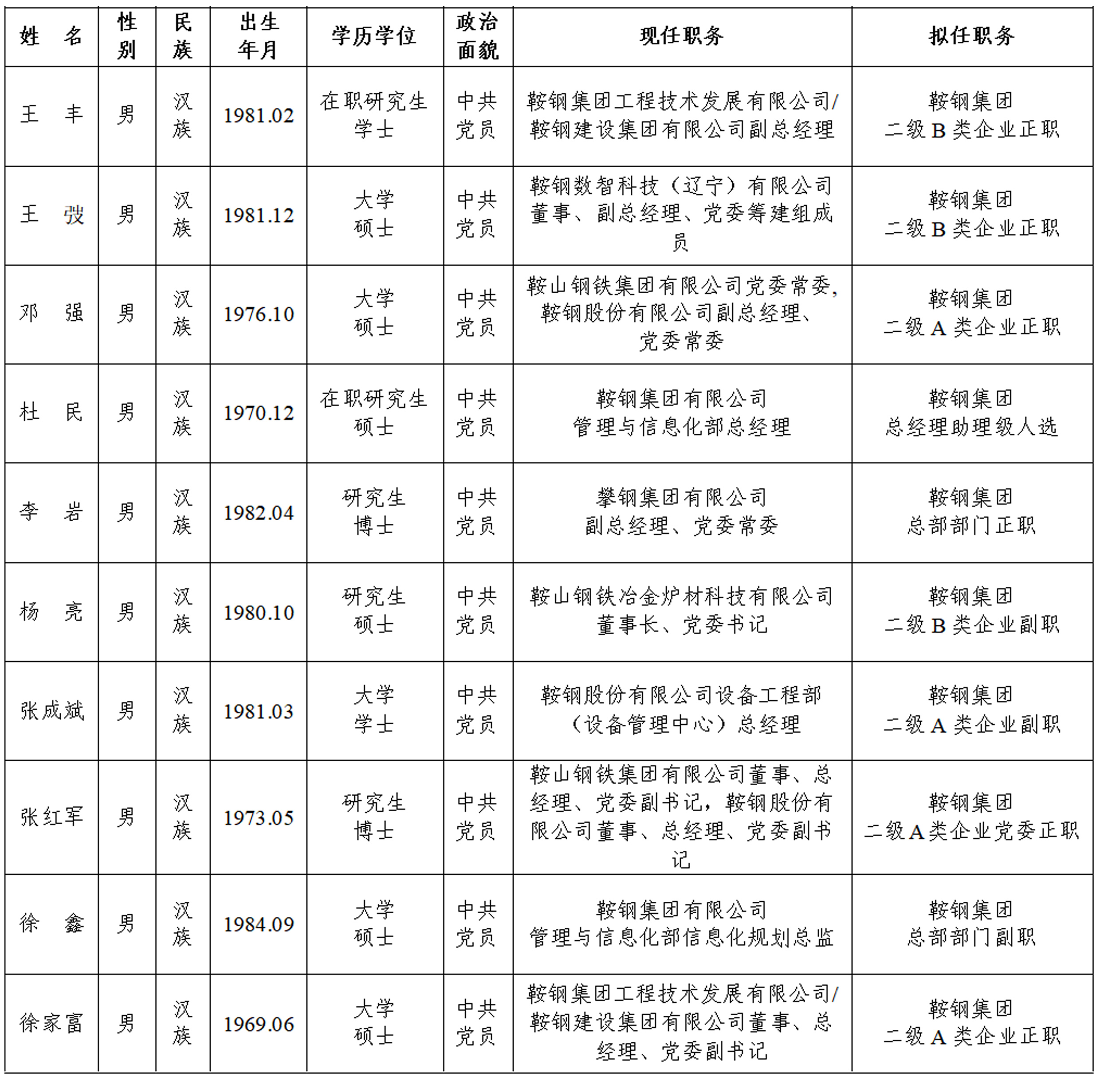 鞍鋼集團有限公司10名擬任職領導人員名單 Vax鞍鋼集團網站